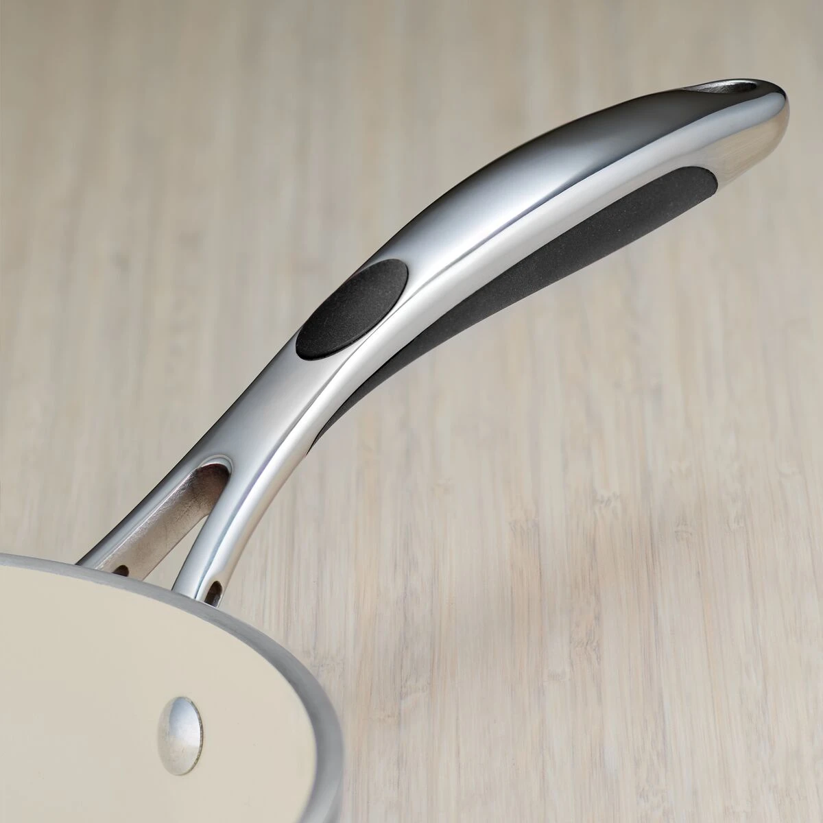 Tramontina”s Ceramica Deluxe 10 in Ceramic Fry Pan is the ideal option for aspiring chefs who want a pop of design in their kitchen, as well as a durable go-to pan for scrambling eggs and making pancakes. The Ceramica Deluxe cookware line features heavy-gauge aluminum construction, a durable porcelain-enamel exterior and an easy-to-clean ceramic interior that is PTFE, PFOA, lead- and cadmium-free. The riveted, ergonomically designed soft-grip cast stainless steel handle provides added support when handling. Oven-safe up to 350°F / 176°C and compatible with gas, electric, and ceramic glass cooktops.