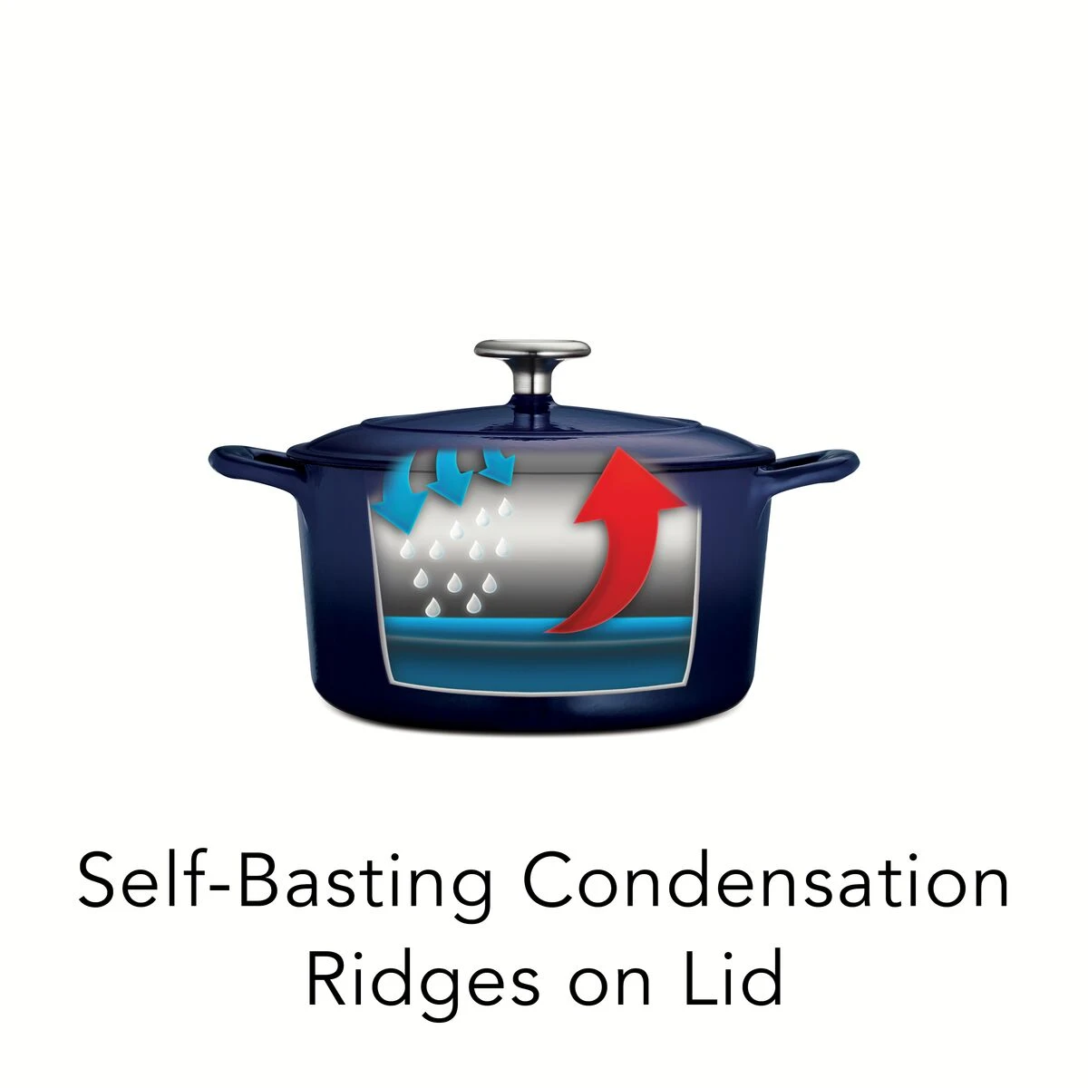 Tramontina”s 3.5 Qt Enameled Cast Iron Round Dutch Oven is ideal for one-pot meals, braising pot roast, slow-cooked stews, and so much more. Prized by cooks for heat retention and even cooking, this beautifully crafted 3.5 Qt Enameled Cast Iron Dutch Oven is an essential piece for any chef”s kitchen. It is available in a variety of striking colors and porcelain enamel exterior finishes – offering elegant kitchen to table serving. The self-basting condensation ridges on the lid uniformly collect and direct vapors onto food, providing outstanding cooking results for flavorful meats, soups, stews, breads, cobblers and many other savory dishes. The heavy-gauge cast-iron cooking surface is coated with an off-white, smooth, and easy-to-clean, PTFE and PFOA-free porcelain enamel. Its integral side handles provide added support when handling a filled pot, and the cast stainless steel knob is oven-safe – giving you flexibility to bake or roast at higher temperatures up to 450°F.