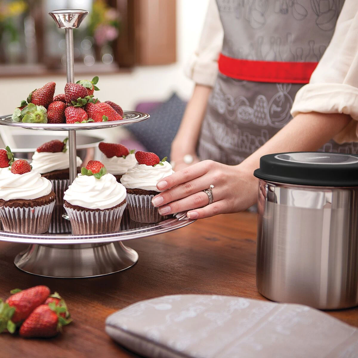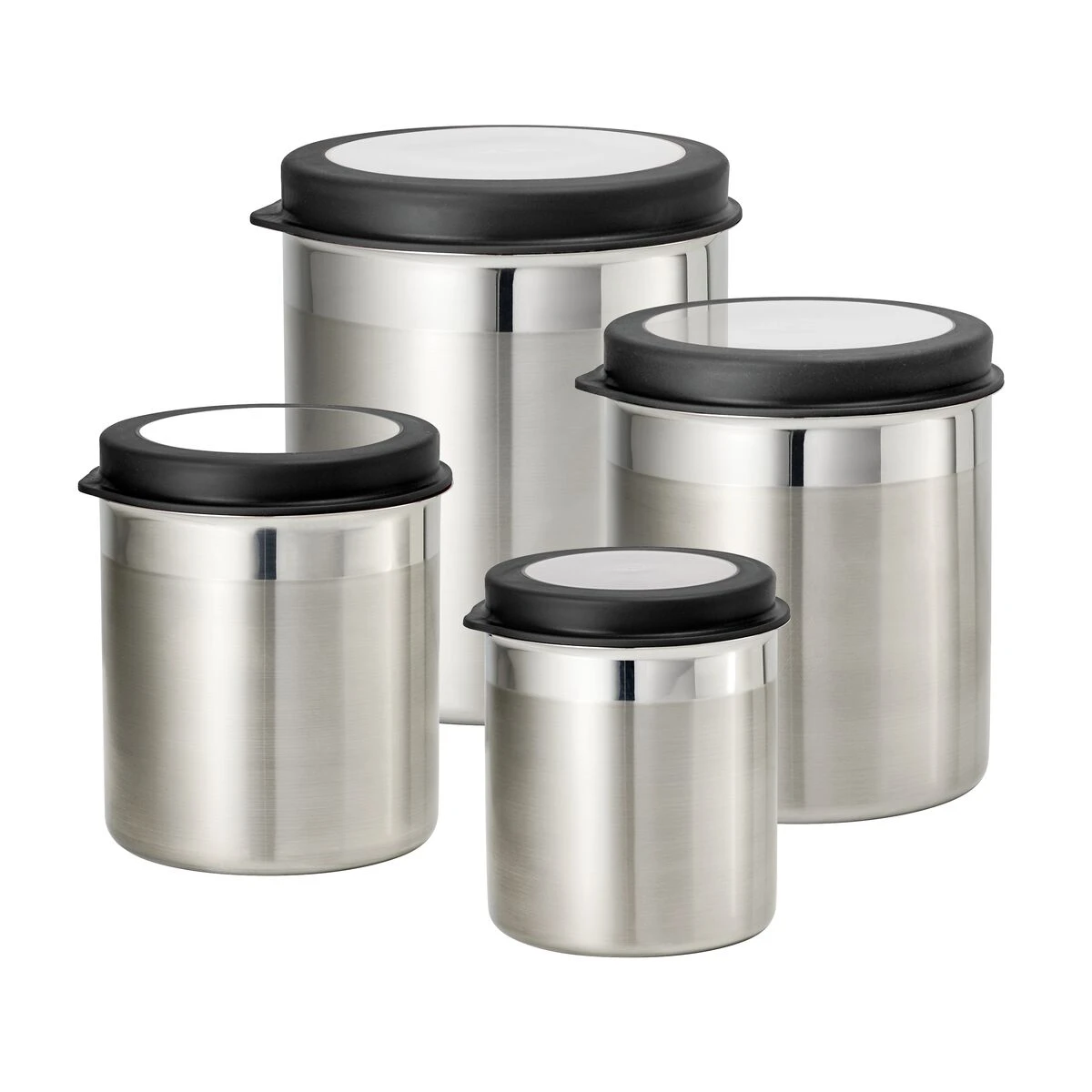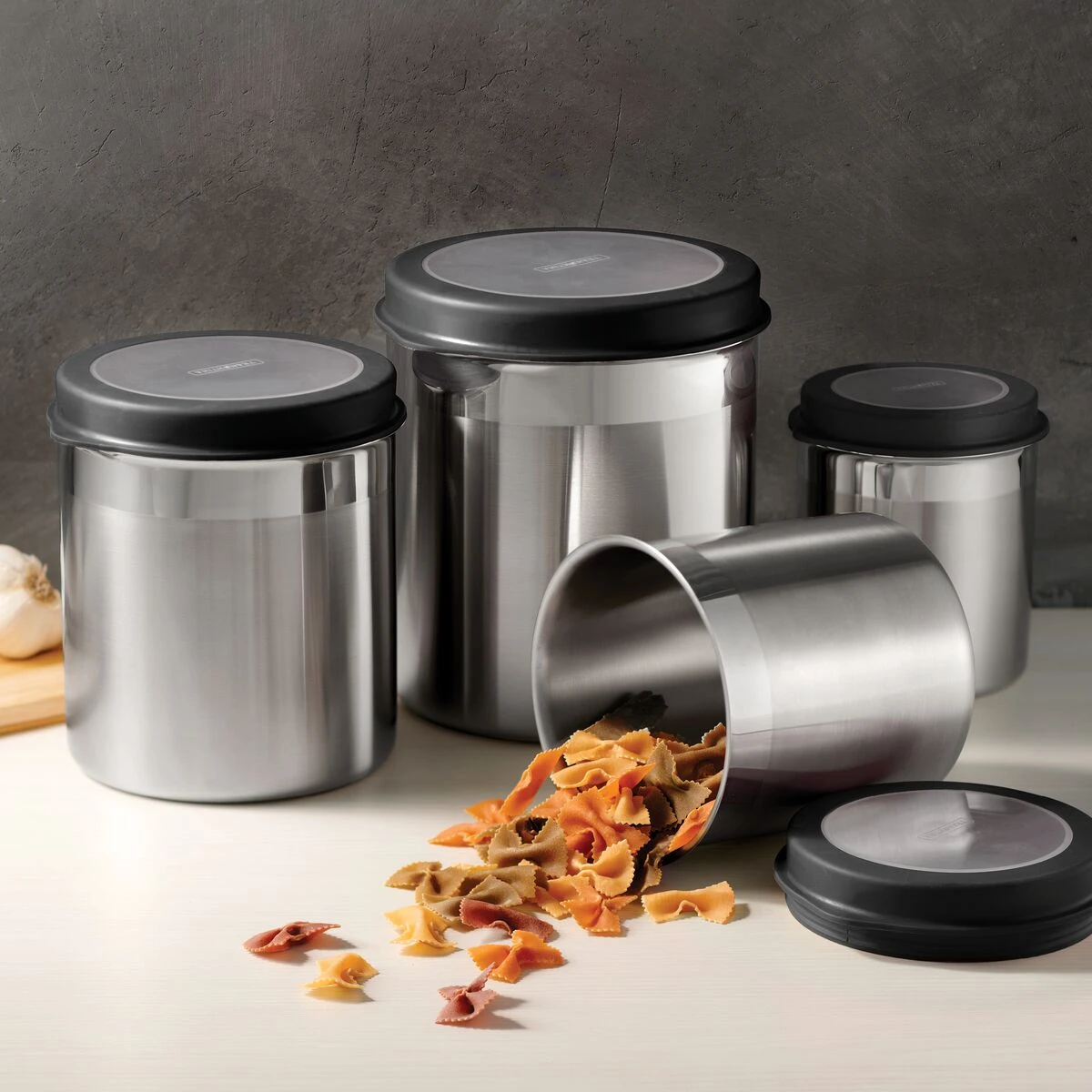 Got pasta, rice, grains, or cereals to store? Get rid of boxes and hard-to-seal packages for good with the Tramontina”s 4 Pc Stainless Steel Canister Set, complete with see-through plastic lids. Made to preserve your non-perishables, the set includes containers in four different sizes, each with its own tight-fitting plastic lid. Each lid also features a window allowing you to see what”s inside at a glance. The set also comes with stickers for labeling your containers” contents. Made of durable 18/10 stainless steel, the set will last long, and its low-maintenance matte finish will look great on any countertop! Available in a variety of colors.