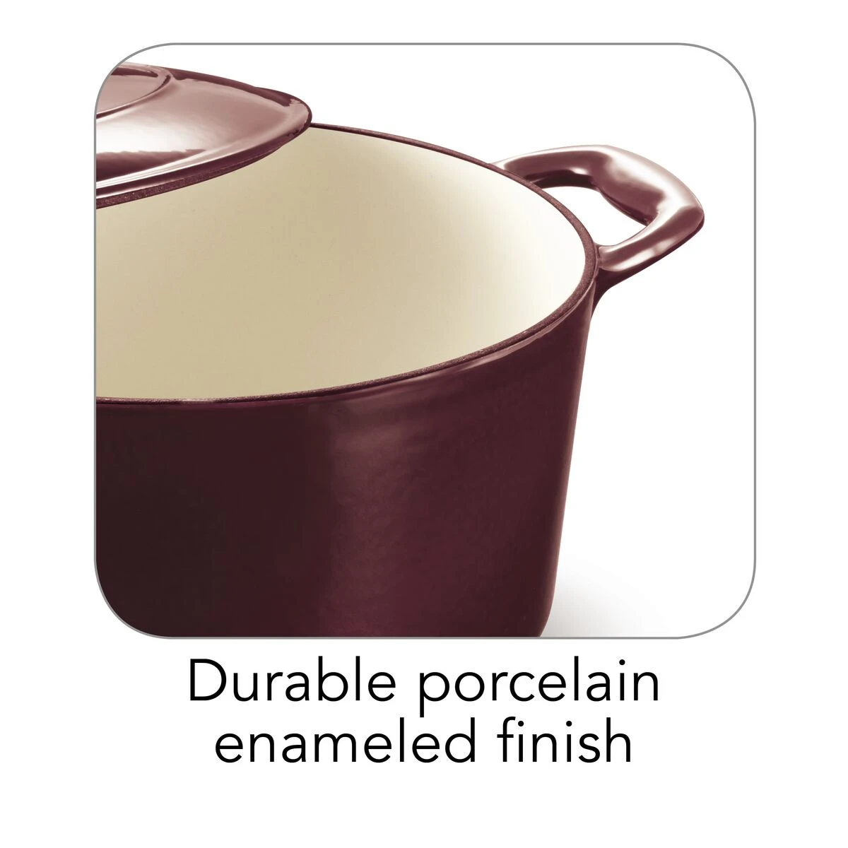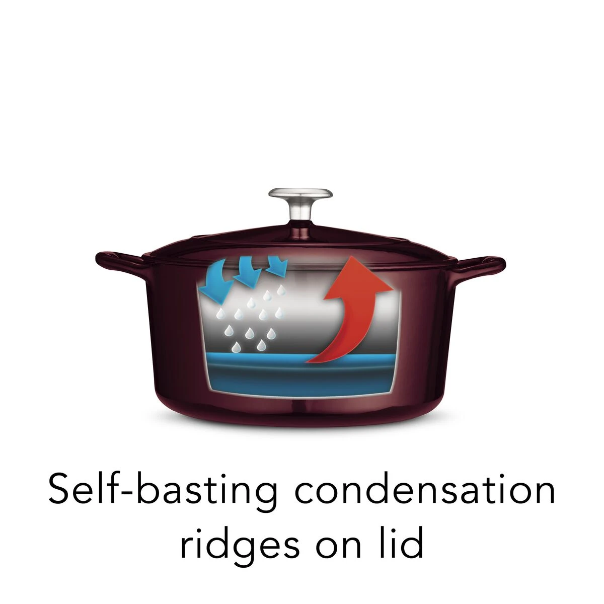Tramontina”s Gourmet Enameled Cast Iron 5.5 Qt Covered Round Dutch Oven was made for one-pot meals, braising pot roast, slow-cooked stews, and so much more. Prized by cooks for heat retention and even cooking, it”s an essential piece for any kitchen. Self-basting condensation ridges on the lid uniformly collect and direct vapors onto food for flavor-filled meats, soups, stews, breads, and cobblers, and almost any thing else. The heavy-gauge cast-iron covered Dutch oven cooking surface is coated with an off-white, smooth, and easy-to-clean, PTFE and PFOA-free porcelain-enamel. Its integral side handles provide added support when handling a filled pot, and the cast stainless steel knob is oven-safe – giving you flexibility to bake or roast at higher temperatures, up to 450°F. As an added detail, this one is available in a variety of striking colors – find one to your style and your taste!
