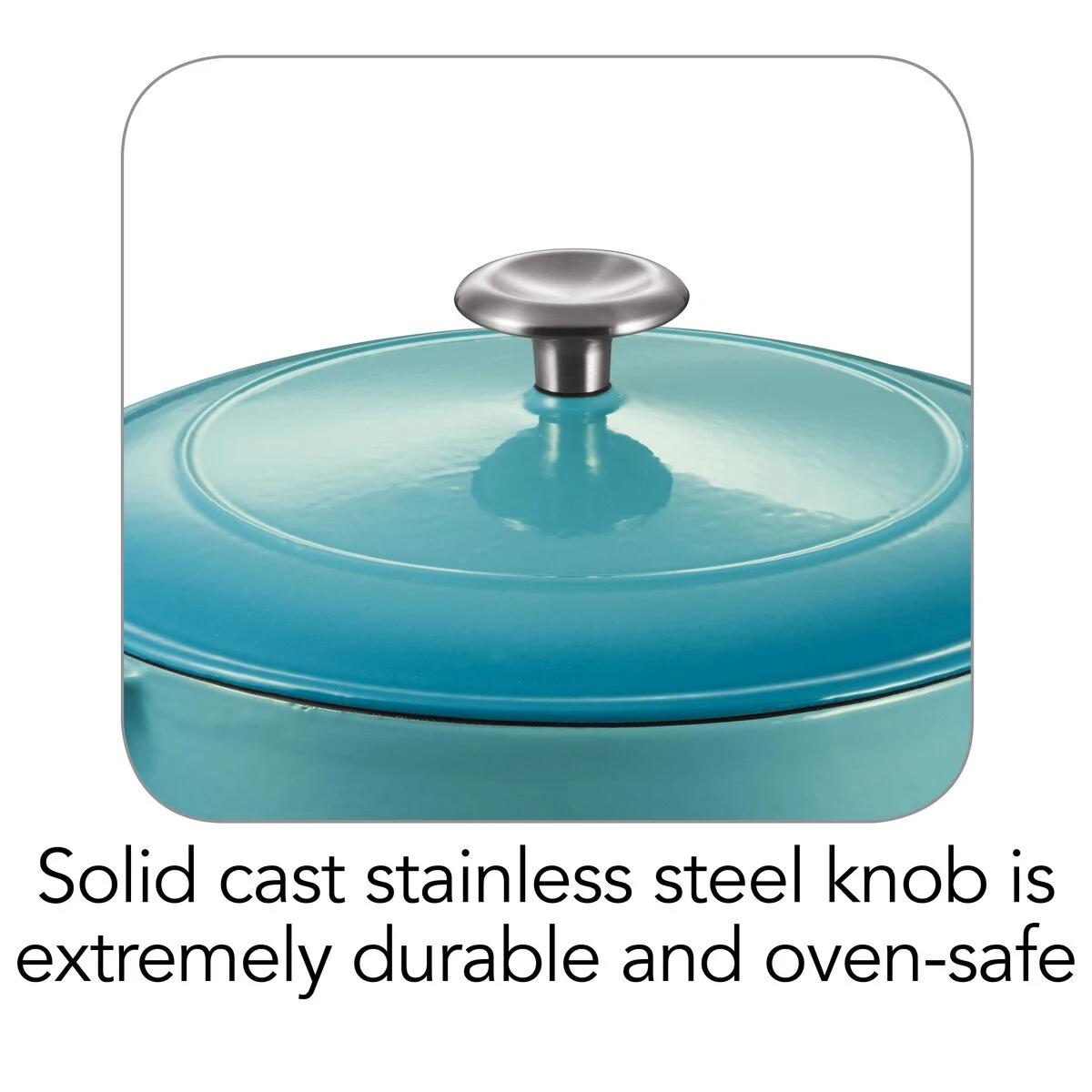 Tramontina”s Gourmet Enameled Cast Iron 5.5 Qt Covered Round Dutch Oven was made for one-pot meals, braising pot roast, slow-cooked stews, and so much more. Prized by cooks for heat retention and even cooking, it”s an essential piece for any kitchen. Self-basting condensation ridges on the lid uniformly collect and direct vapors onto food for flavor-filled meats, soups, stews, breads, and cobblers, and almost any thing else. The heavy-gauge cast-iron covered Dutch oven cooking surface is coated with an off-white, smooth, and easy-to-clean, PFOA- and PTFE-free porcelain-enamel. Its integral side handles provide added support when handling a filled pot, and the cast stainless steel knob is oven-safe giving you flexibility to bake or roast at higher temperatures, up to 450 F. As an added detail, this one is available in a variety of striking colors -find one to your style and your taste!