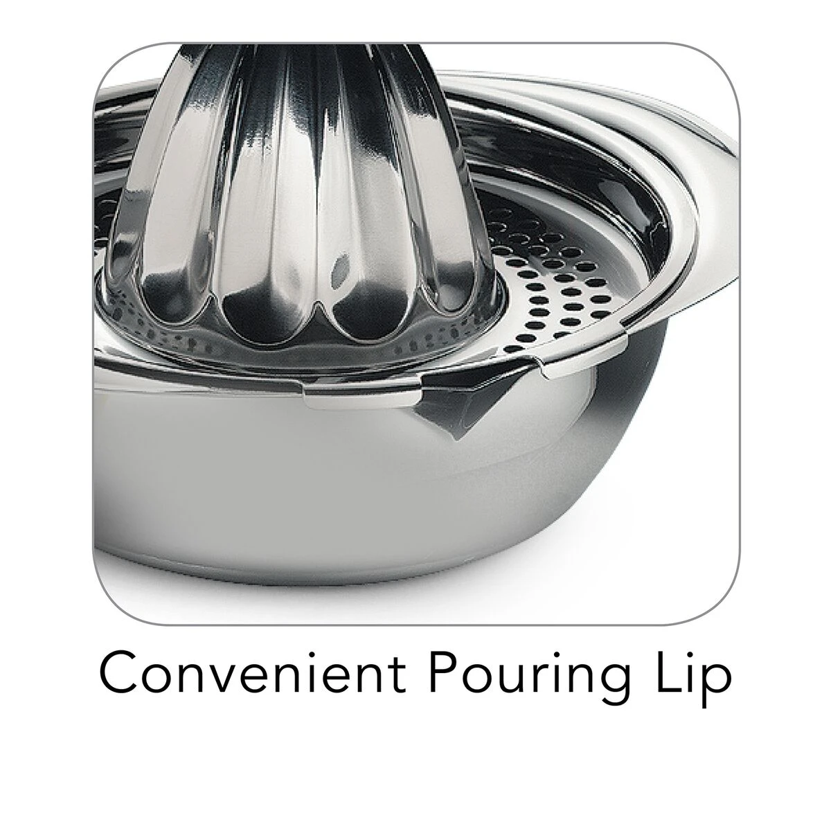 The Tramontina Gourmet 13 oz. Citrus Juicer is ideal for squeezing fresh juice from your favorite small to medium citrus fruits. It is made of 18/10 stainless steel, has a classic design that is durable and has a convenient pouring lip. It is small enough to store in your cupboard, simple to use, easy to clean, dishwasher-safe, made in Brazil, proudly packaged in USA and offered under a Lifetime Warranty.