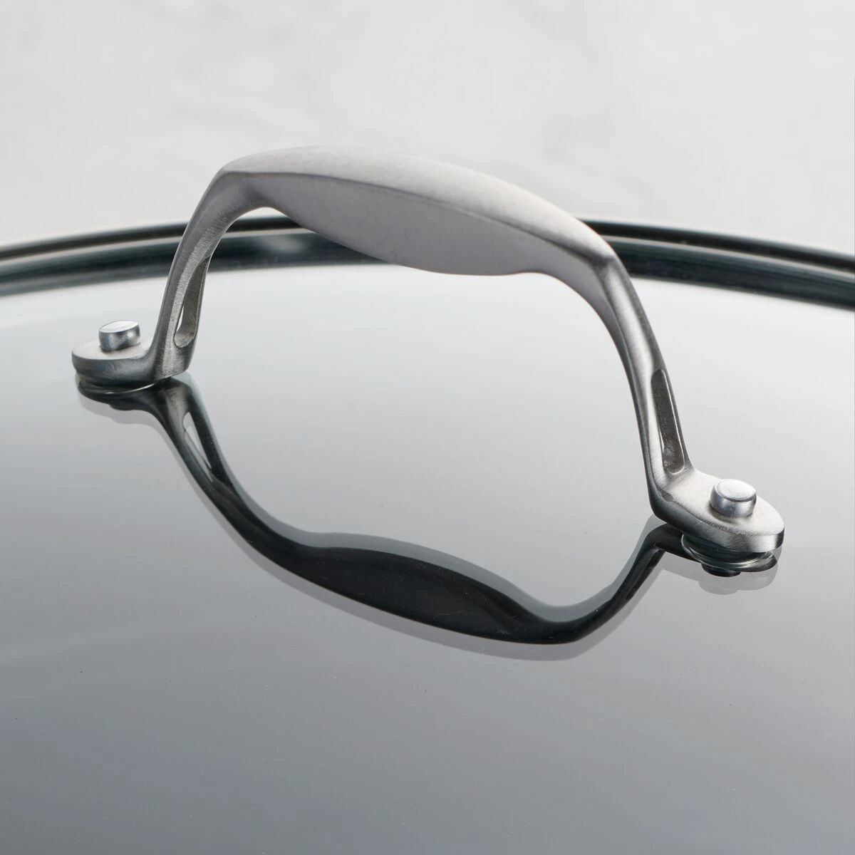 – Heat- and shatter-resistant tempered glass lids with wide stainless steel rim