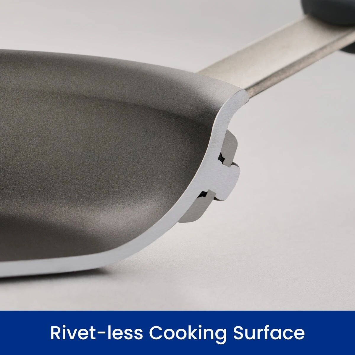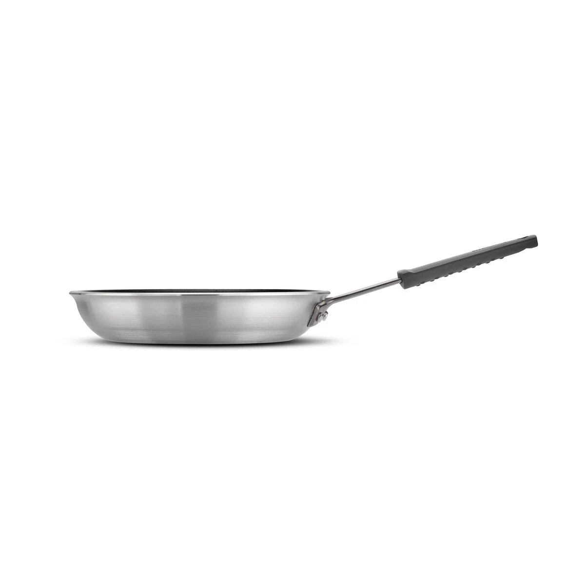 Fry, scramble, brown, saute, and sear like an experienced chef Tramontina`s PRO Fusion 10 in Fry Pan features a new Fusion Rivet System which provides a rivet-less, smooth interior cooking surface. This clever and exclusive system provides easy cooking and effortless cleanup, while maintaining all the strength and durability of a traditional riveted handle assembly, and the cast stainless steel handle features a removable, silicone, soft-grip for maneuverability. The rivet-less cooking surface, combined with the advanced nonstick coating, provides high performance and excellent food release. The fry pan”s commercial-grade, heavy-gauge aluminum construction distributes heat quickly and evenly. These pans are designed and manufactured to withstand the rigors of a professional kitchen, and easily adapt to home and non-commercial use for everyday use. This cookware is NSF certified, compatible with gas, electric and ceramic glass cooktops, can be used in the oven up to 400°F / 204°C.